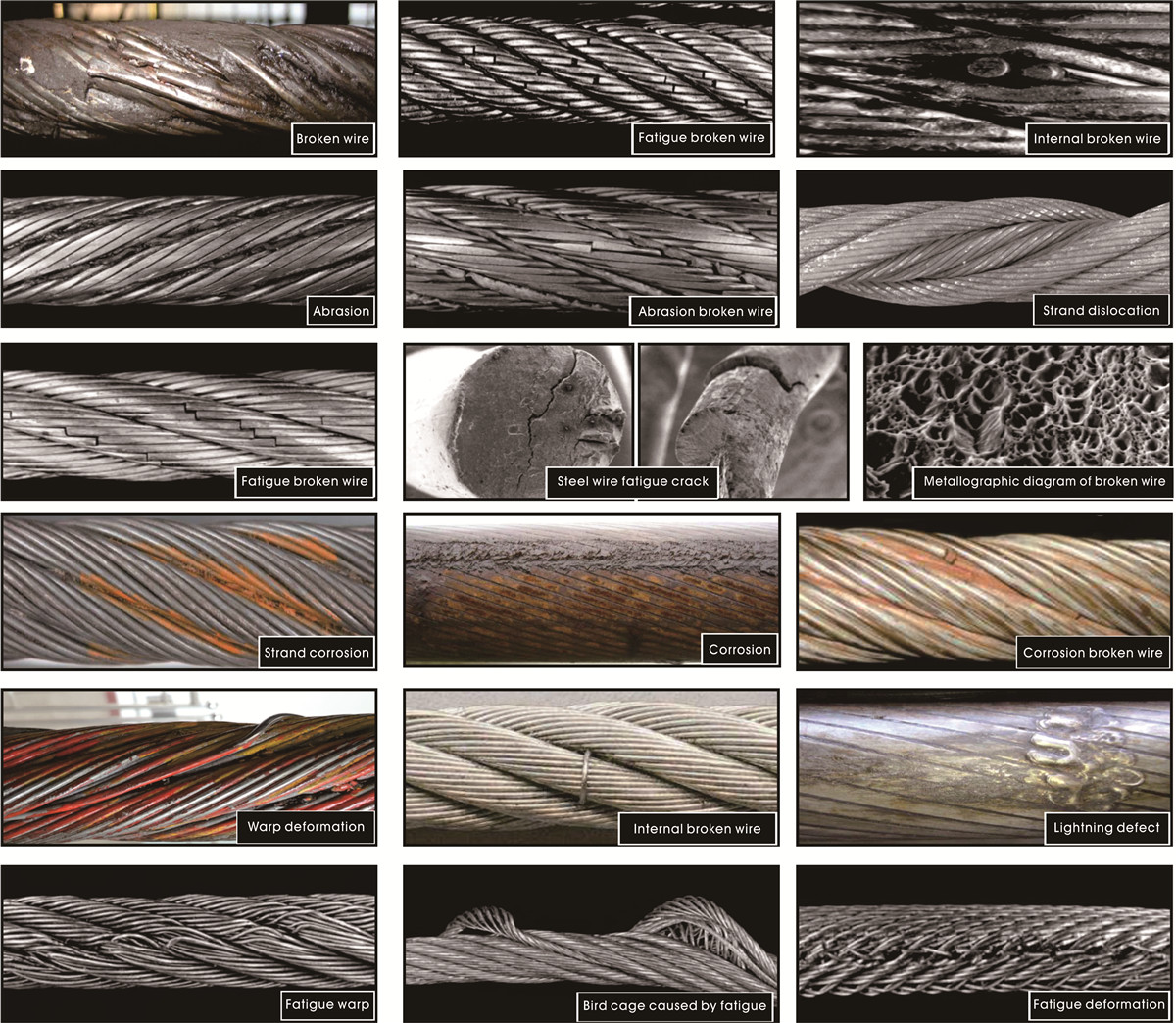 Выполняется обнаружение обрывов жил, износа, коррозии, деформации, усталости металла и другие повреждения стального троса.