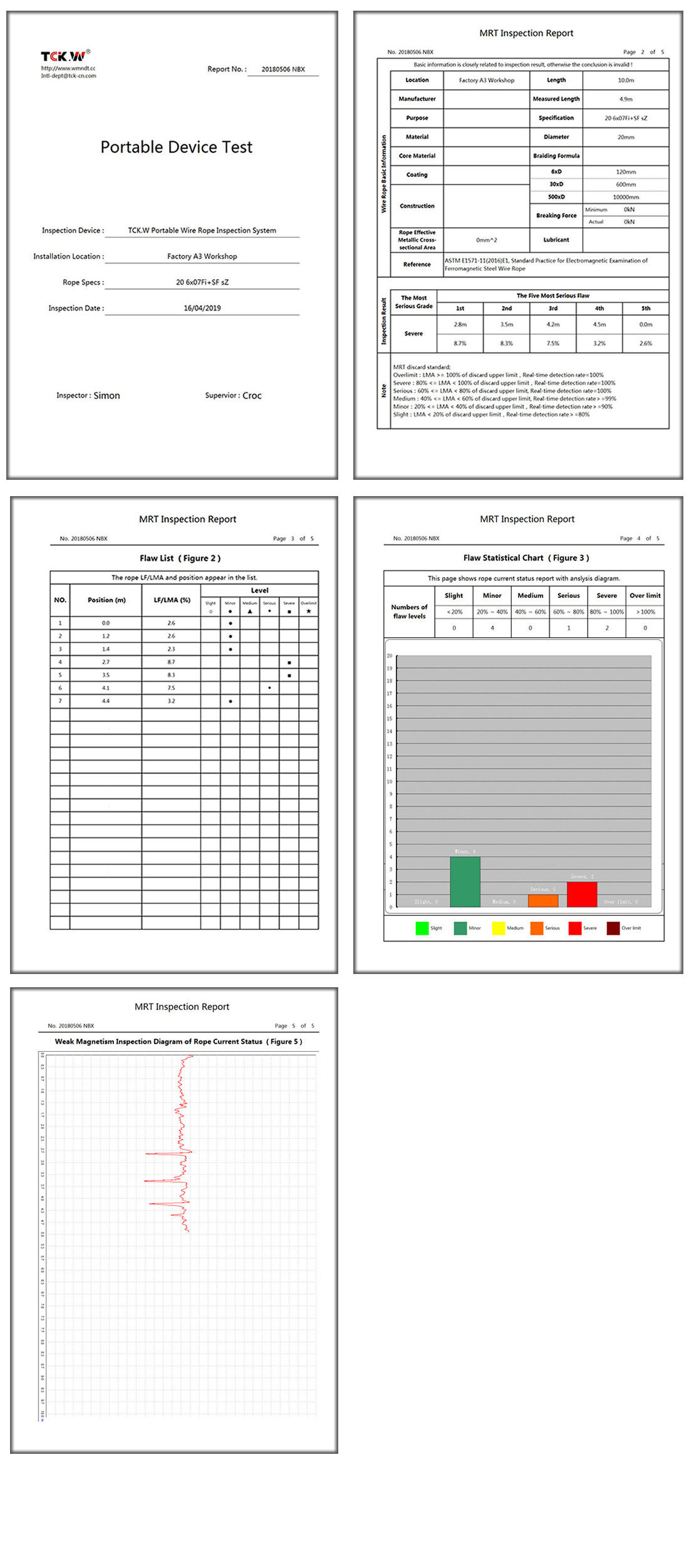 Серийная продукция TCK.W соответствуют требованиям международного стандарта (ISO3154) безопасности стальных тросов по проверке и подтверждению предельной нагрузки. В результате контрольной диагностики в режиме онлайн и количественного определения коэффициента потерь чистой площади сечения фактического несущего металла, возникшего из-за обрыва проволоки, истирания, коррозии, усталости металла и других различных повреждений внутри и снаружи стального троса, осуществляется правильная оценка остаточной несущей способности и срока службы проверенного стального троса, таким образом пользователям предоставляются научные обоснования для безопасного использования и рационального обновления тросов, отвечающие требованиям стандартов